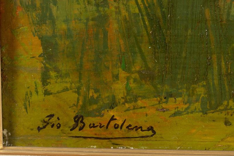 GIOVANNI BARTOLENA (Livorno 1866 - 1942) "Paesaggio di campagna con figure e cavalli". Olio su tavola. Cm 52x103. Opera firmata in basso a sinistra Gio Bartolena. Al retro reca timbro Manzoni sas Galleria d’Arte, Milano e iscrizione per autentica a firma M. Borgiotti “Opera autentica/ed importante di/Giovanni Bartolena”.