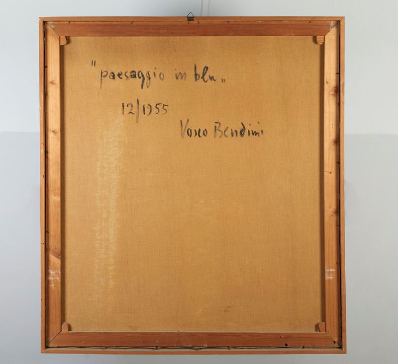 VASCO BENDINI (Bologna 1922 - Roma 2015) "Paesaggio in blu", 1955. Cm 100x90. Opera firmata e datata in basso a destra V. Bendini '55. Al retro opera intitolata, datata e firmata Paesaggio blu, 12/1955, Vasco Bendini.