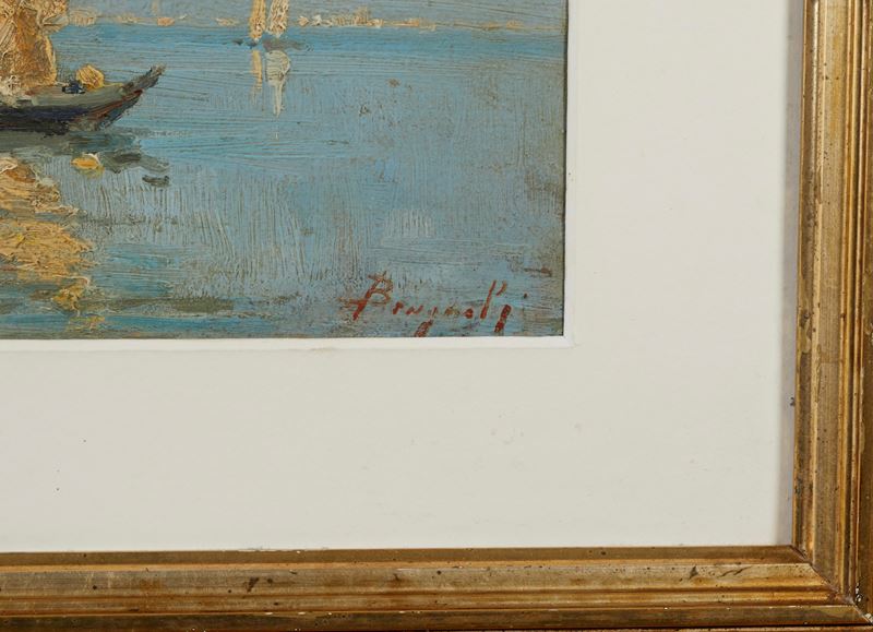 EMANUELE BRUGNOLI (Bologna, 1859 - Venezia, 1944) “Venezia”. Olio su tavola. Cm 30X40. Opera firmata in basso a destra Brugnoli. Al retro reca vecchio cartiglio d’asta.