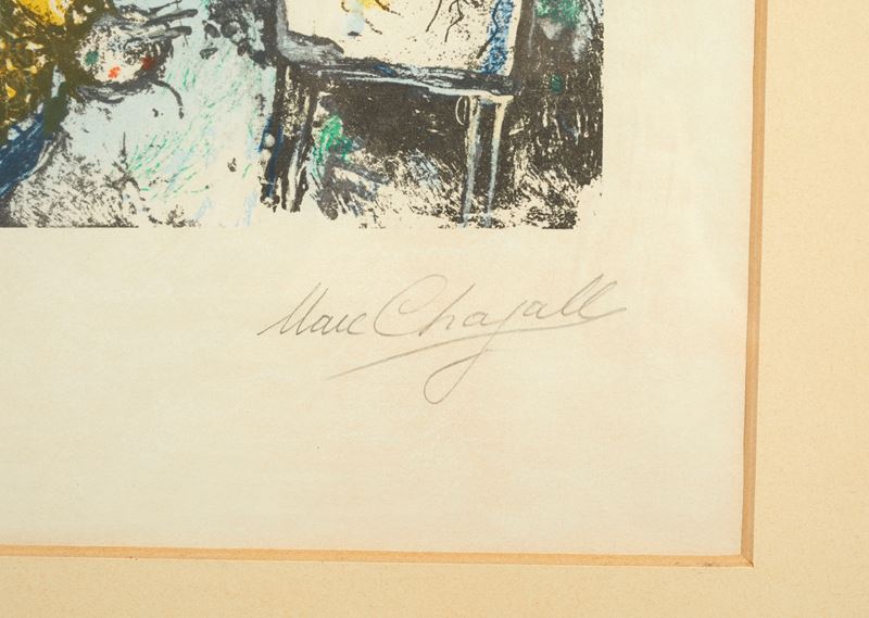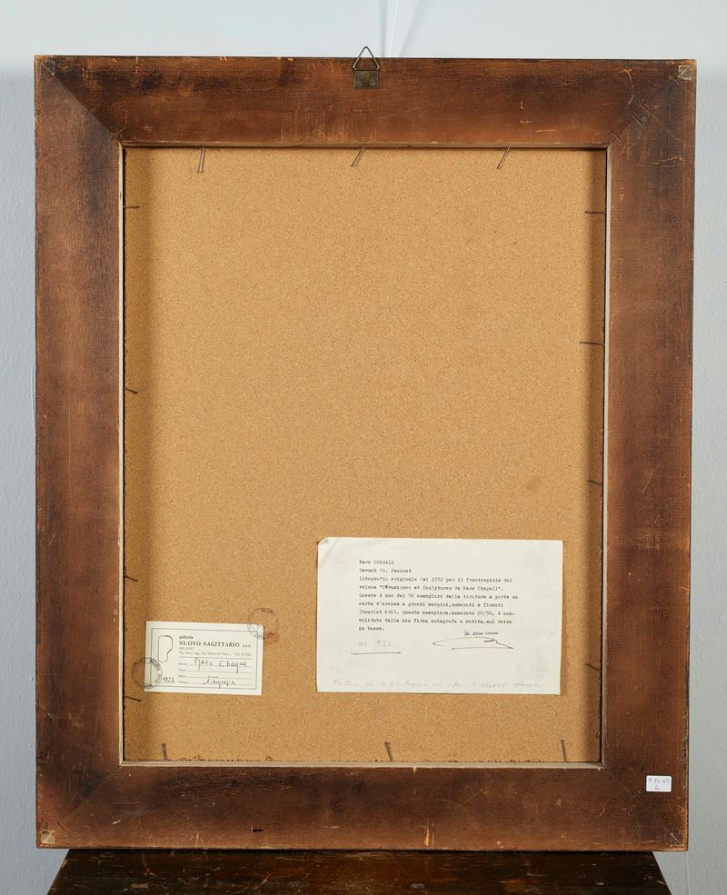 MARC CHAGALL (Lezna 1887 - San Paolo di Venza 1985) "Devant St. Jeannet", 1972. Litografia a colori su carta. Cm 33,5x24,5. Opera firmata in basso a destra Marc Chagall. Reca numeri di tiratura in basso a sinistra 20/50. Al retro riporta etichetta e timbro della Galleria Nuovo Sagittario, Milano. Realizzata per il frontespizio del volume "Ceramiques et sculputers de Marc Chagall". Opera accompagnata da autentica su fotografia con timbro della Galleria Marescalchi e doppia firma di Mario Marescalchi.