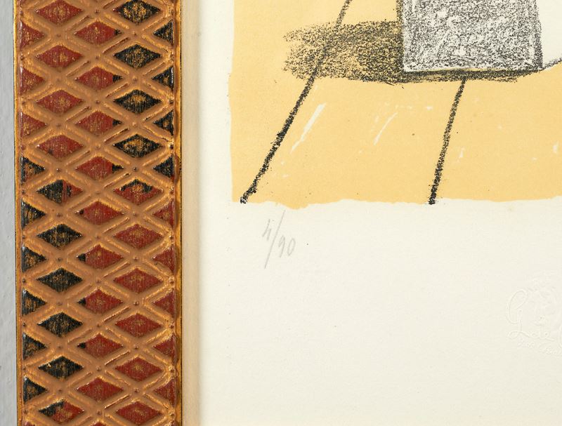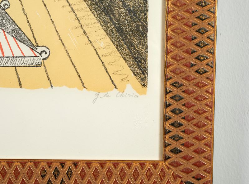 GIORGIO DE CHIRICO (Volos 1888 – Roma 1978) “Interno metafisico”, 1970. Litografia a colori su carta. Cm lastra: 58,5x45. Opera firmata in basso al destra G. de Chirico. Opera intitolata Interno Metafisico. Reca numeri di tiratura in basso a sinistra 4/90. Reca timbro a secco di Alberto Caprini Stampatore Roma. Reca timbro a secco dello studio dell’artista.