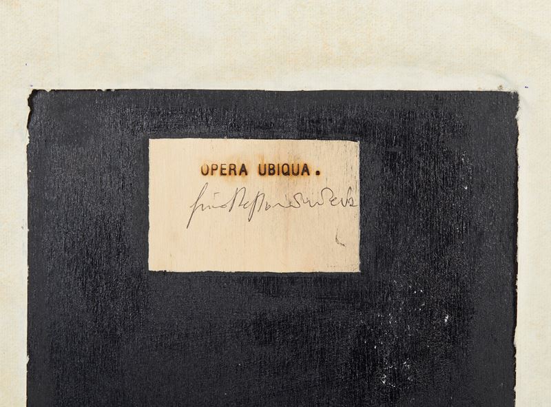 Questa straordinaria tavola in foglia d’oro incarna l’essenza della ricerca artistica di Gino De Dominicis, in cui il visibile e l’invisibile si fondono in un’iconografia senza tempo. Il titolo Opera Ubiqua racchiude il cuore della sua poetica: l’idea di un’arte che trascende la dimensione fisica e diventa onnipresente, sottraendosi alle leggi del tempo e dello spazio.