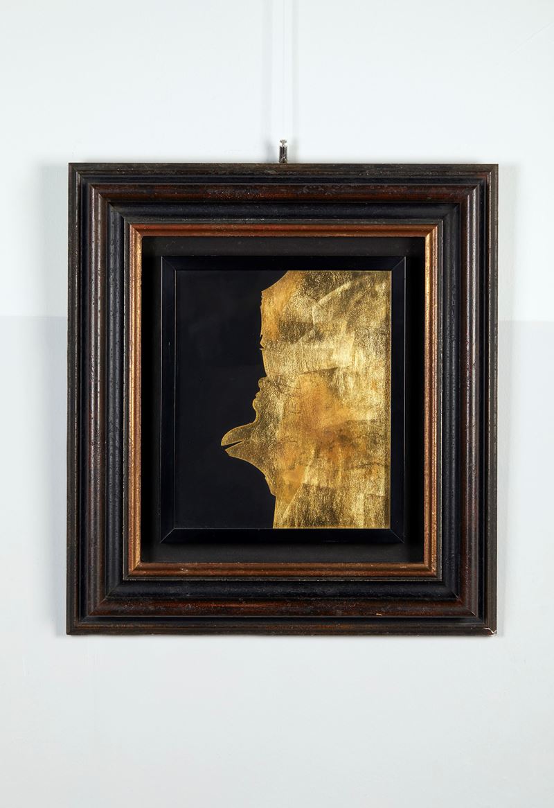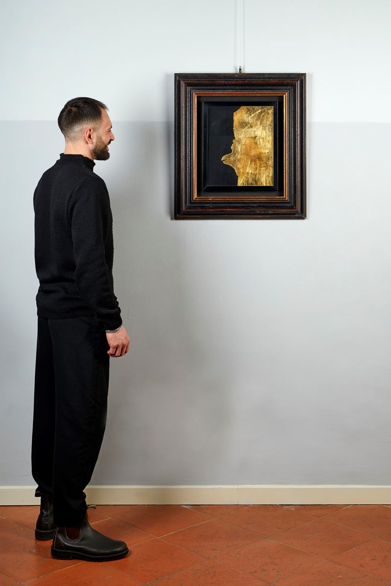 Il contrasto tra l’oro, simbolo di eternità e sacralità, e il fondo nero, evocazione del mistero e dell’ignoto, crea un impatto visivo potente e raffinato, in linea con la sua incessante riflessione sulla dimensione metafisica dell’esistenza.