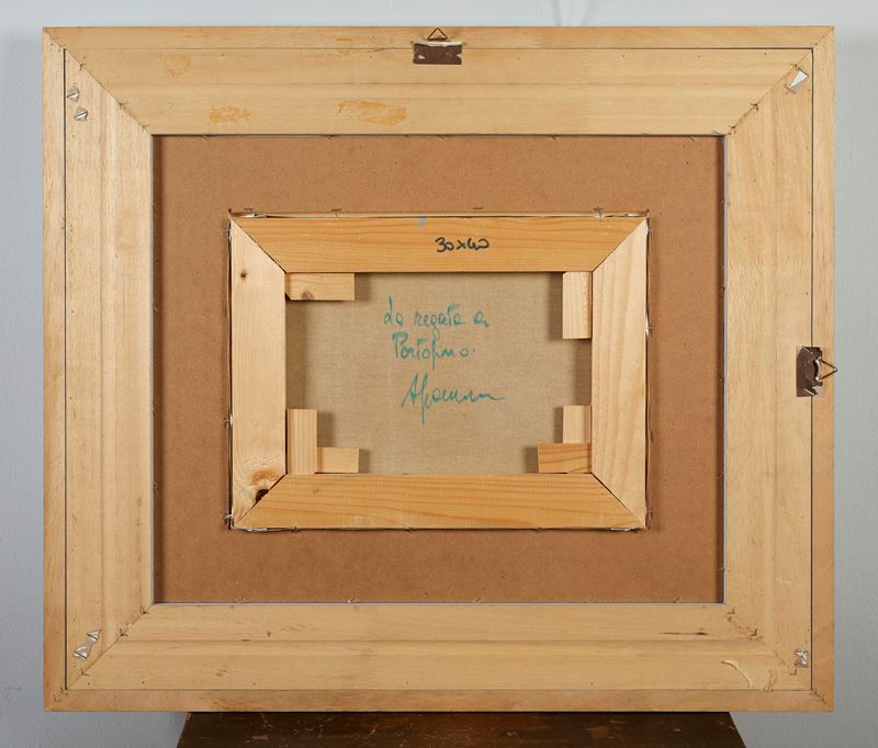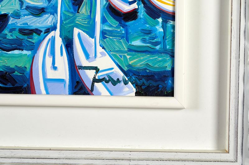 ATHOS FACCINCANI (Peschiera del Garda 1951) "La regata a Portofino", 2011. Cm 30x40. Olio su tela. Opera firmata in basso a destra Faccincani. Al retro opera firmata e intitolata. Opera accompagnata da autentica su fotografia con firma dell'artista.