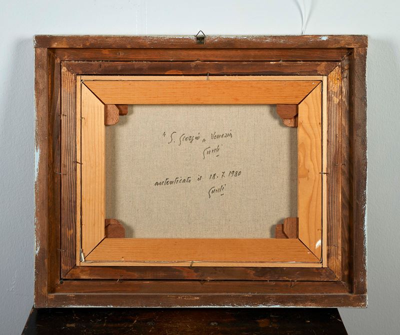 VIRGILIO GUIDI (Roma 1891 - Venezia 1984) “San Giorgio Venezia”. Anni 70. Olio su tela. Cm 30x40. Opera firmata in basso a destra Guidi. Al retro opera intitolata e firmata San Giorgio Venezia, Guidi. Al retro reca scritta “Autenticato il 18/07/1980, Guidi”.