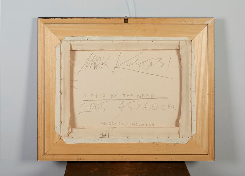 MARK KOSTABI (1960) "Lifted by the need", 2005. Olio su tela. Cm 45x60. Opera datata, firmata e intitolata sul retro Mark Kostabi, Lifted by the need, 2005. Al retro reca scritta 1-6-0-6 Collins Wilke. Opera accompagnata da autentica.