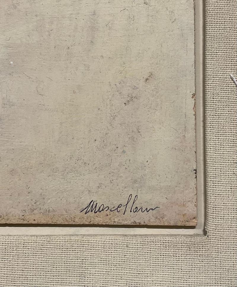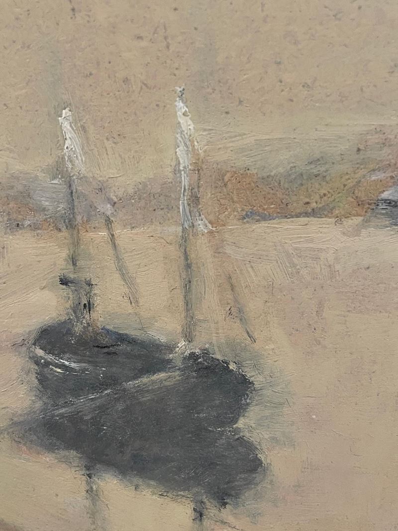 NORMA MASCELLANI (Bologna 1909 - Bologna 2009) "Marina con barca". Olio su tavola. Cm 29,5x24. Opera firmata in basso a destra Mascellani.
