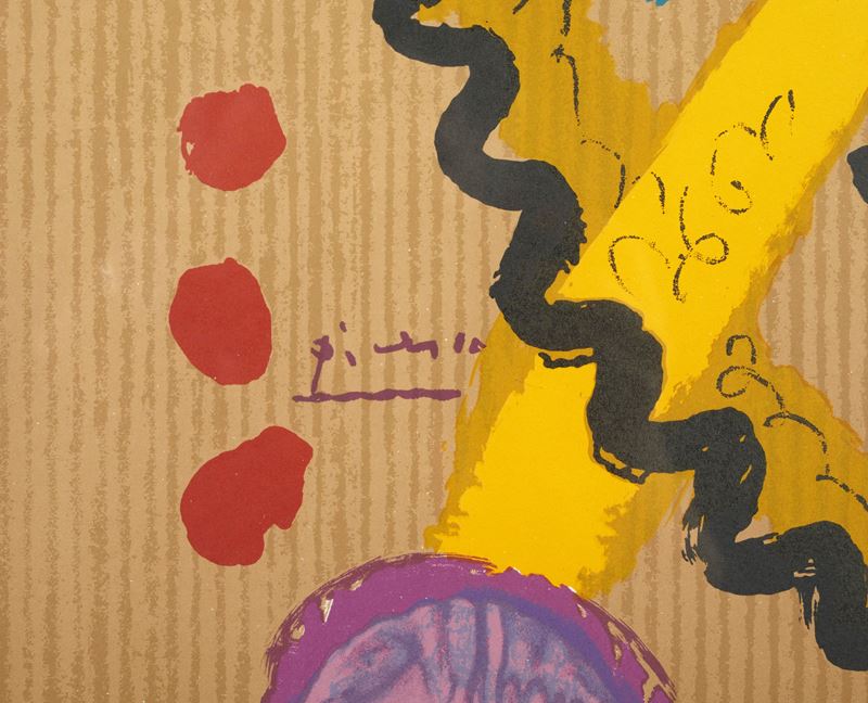 PABLO PICASSO (Malaga 1881 - Mougins 1973) "Portrait imaginaire", 1969. Litografia a colorí su carta. Cm lastra: 55x40. Esemplare privo di firma. Reca numeri di tiratura in basso a sinistra A 85/250 (A - esemplare realizzato per gli Stati Uniti). Al retro reca etichetta AEditions Cercle d'art, Paris, 1970.