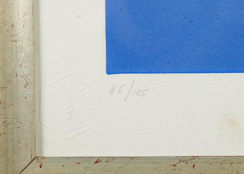 EMILIO SCANAVINO “Composizione”, 1985. Litografia a colori su carta. Cm 70x50. Opera firmata in basso a destra Scanavino. Reca in basso a sinistra numeri di tiratura 86/125. Al retro reca etichetta della Galleria de' Foscherari, Bologna.