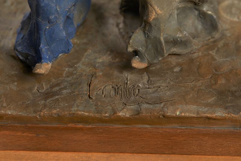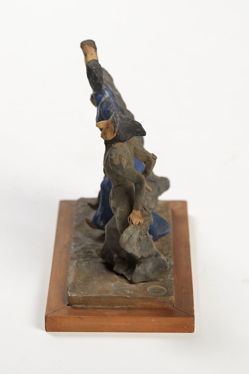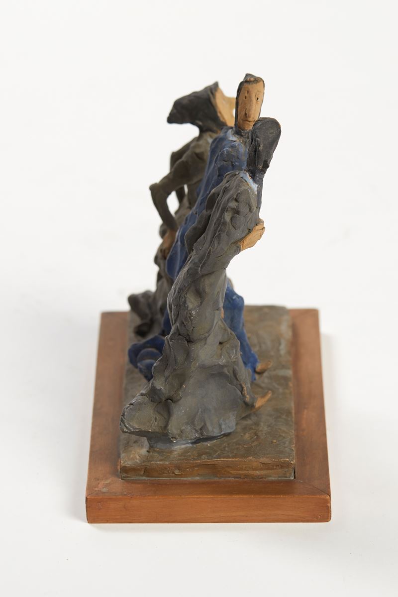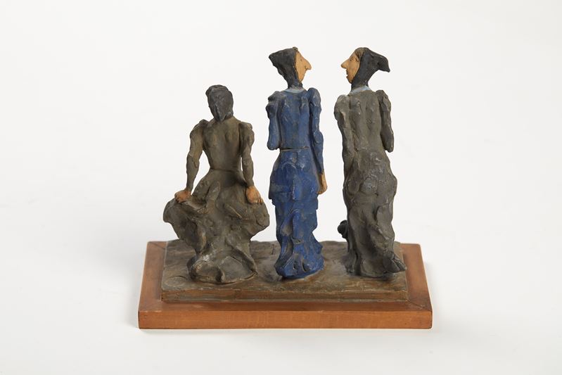 CLETO TOMBA (Castel San Pietro Terme 1898 - Bologna 1987) "Tre comari". Scultura in terracotta policroma. Cm 17x16,4x7,6. Opera firmata davanti Tomba. A lato reca timbro.