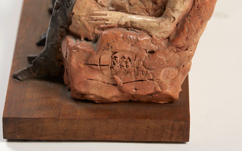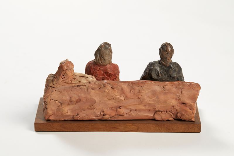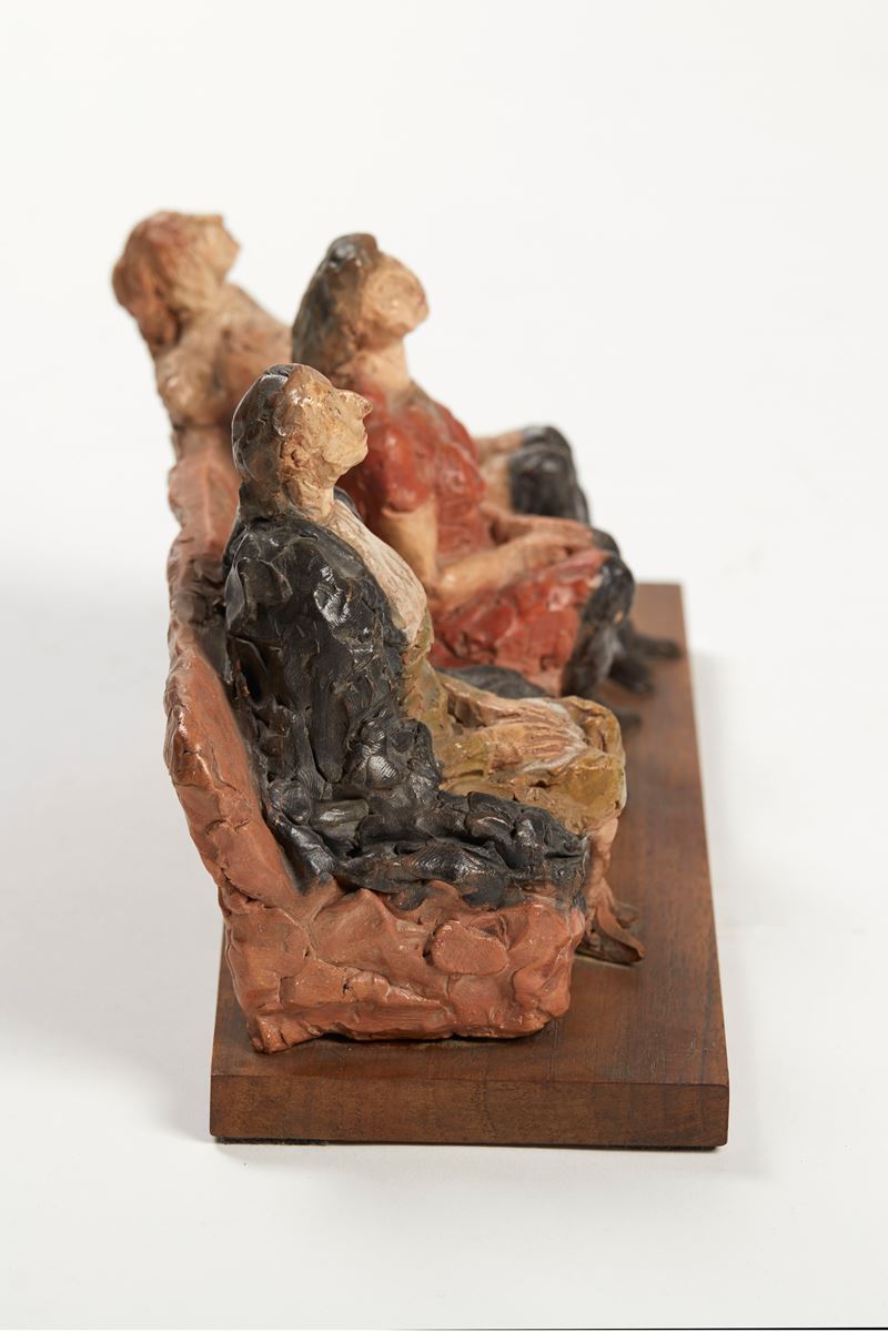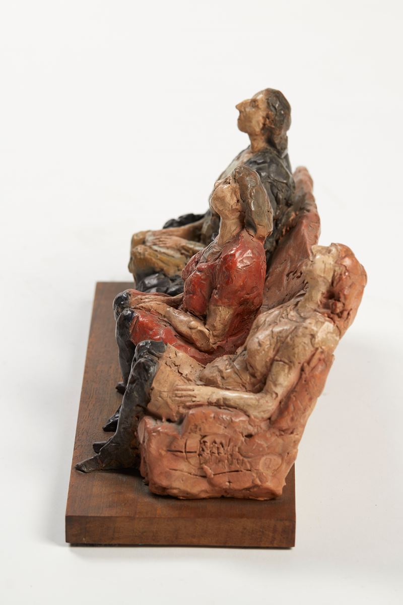 CLETO TOMBA (Castel San Pietro Terme 1898 - Bologna 1987) "Tre figure in poltrona". Scultura in terracotta policroma. Cm 15x27x13. A lato opera firmata Tomba. A lato reca timbro.