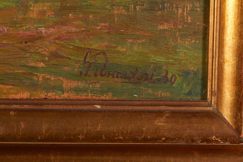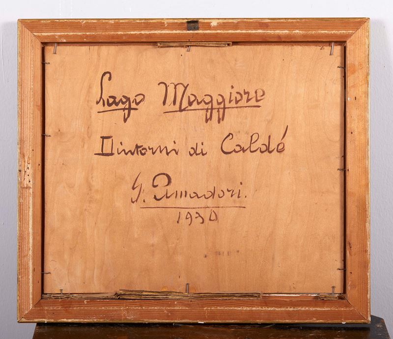 GIULIANO AMADORI (Bologna 1883 - 1972) “Lago maggiore”, 1930. Olio su tavola. Cm 37x44,5. Al retro opera intitolata, firmata e datata Lago Maggiore, Giuliano Amadori, 1930.
