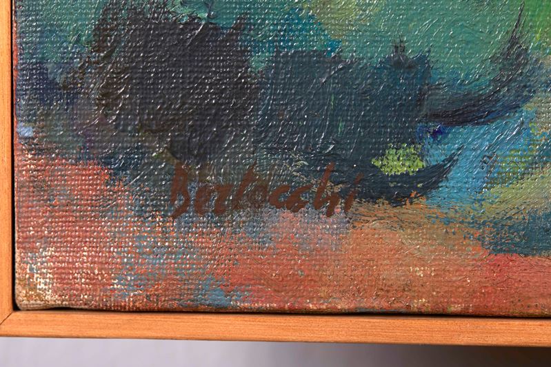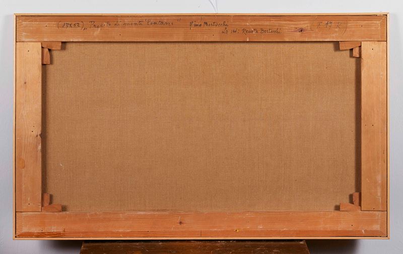 NINO BERTOCCHI (Bologna 1900 – Monzuno 1956) “Profilo di monti lontani”. Olio su tela. Cm 52x87. Opera firmata in basso a sinistra Bertocchi. Opera intitolata, firmata e datata al retro sul telaio.