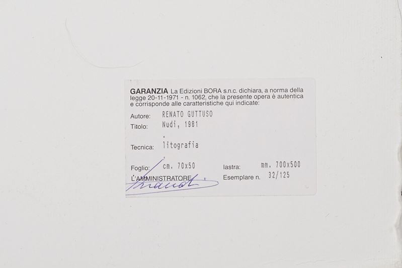 RENATO GUTTUSO (Bagheria 1911 - Roma 1987) "Nudi", 1981. Litografia su carta. Cm 70x50. Opera firmata in basso a destra. Reca numeri di tiratura in basso a sinistra 32/125.
