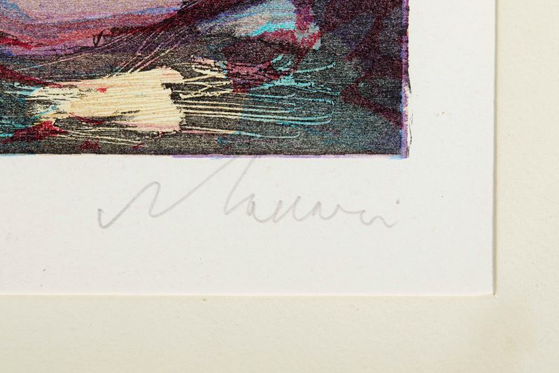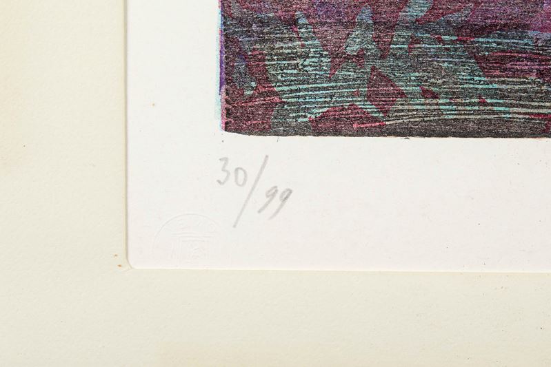 MINO MACCARI (Siena 1898 – Roma 1989) “Senza titolo”. Litografia a colori su carta. Cm lastra: 39.5x53.5. Opera firmata in basso a destra. Reca numeri di tiratura in basso a sinistra 30/99.