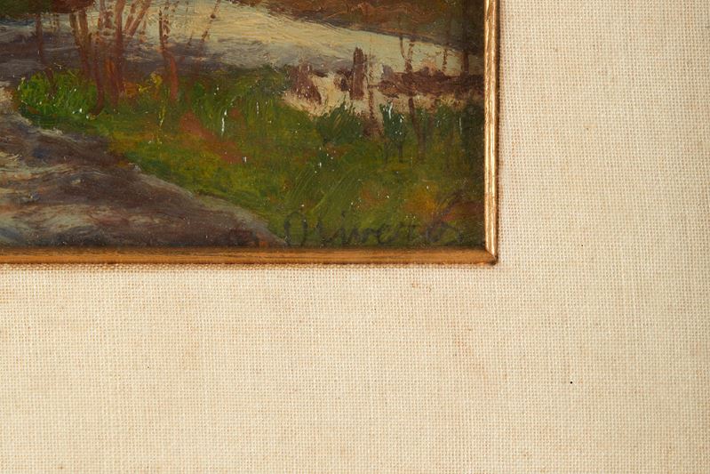MATTEO OLIVERO (Pratorotondo 1879 – Saluzzo 1932) "Paesaggio", 1924. Olio su tavola. Cm 14x15,5. Olio su tavola. Opera intitolata in basso a destra M. Olivero. Al retro opera firmata e datata Matteo Olivero. Al retro porta dedica.