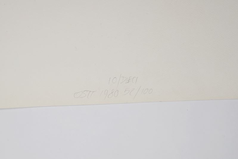 MAURIZIO OSTI(sasso Marconi 1944) “Io/Dieci”. Litografia a colori su carta con interventi a collage. Cm foglio 70,5x52. Opera firmata, datata e intitolata in basso al centro Osti, 1980, Io/Dieci. Reca numeri di tiratura in basso al centro 52/100.