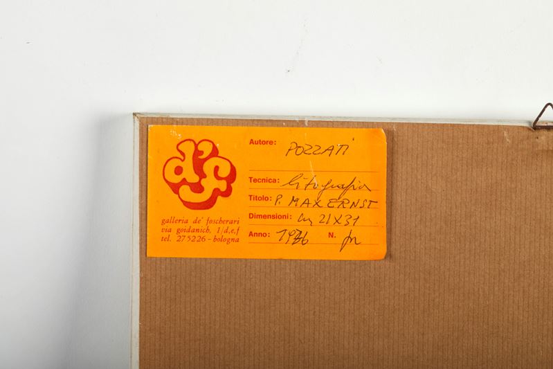CONCETTO POZZATI (Vo’ 1935 – Bologna 2017) “Per Max Ernst”, 1976. Litografia a colori su carta. Cm 21x31. Opera firmata in basso a destra Pozzati. Reca numeri di tiratura in basso a sinistra p.a. Al retro reca etichetta della Galleria de’ Foscherari, Bologna.