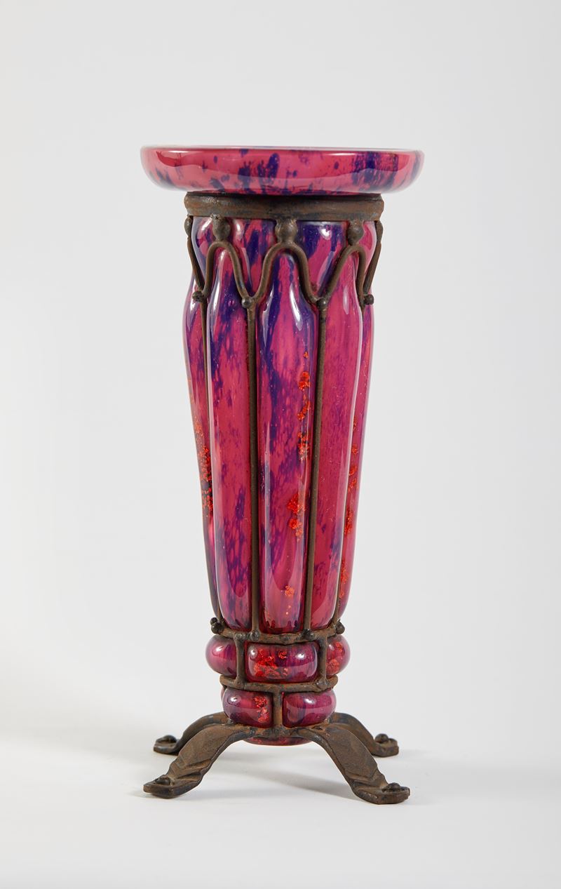 DAUM NANCY Vaso in vetro incamiciato sui toni del viola, con armatura in ferro. Inizi del XX secolo, Francia. Cm 25,5x11,5. Sotto la base reca firma all'acido Daum Nancy France S. Majorelle.