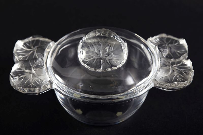 LALIQUE Portacaramelle con decori di foglie in vetro. XX secolo. Cm 9x19x13. Reca sotto la base firma a punta di diamante Lalique France.