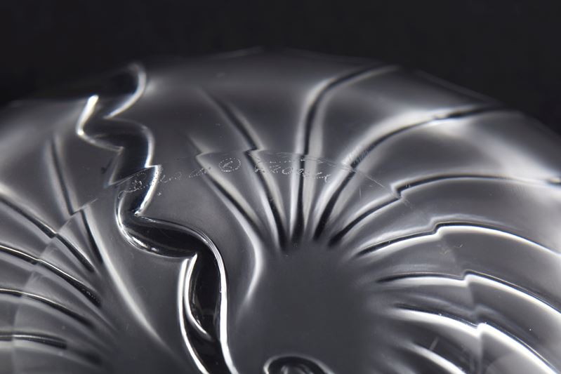 LALIQUE Posacenere in vetro satinato. XX secolo, Francia. Cm 7x21,5x17,5. Opera Firmata a punta di Diamante