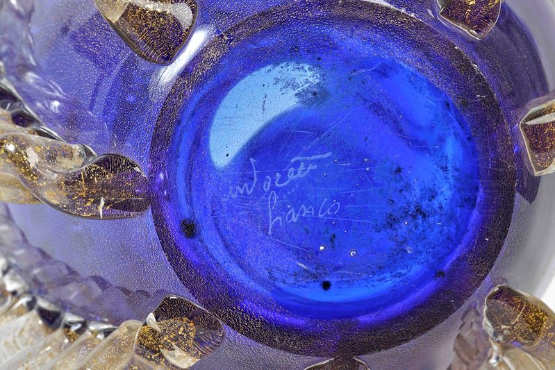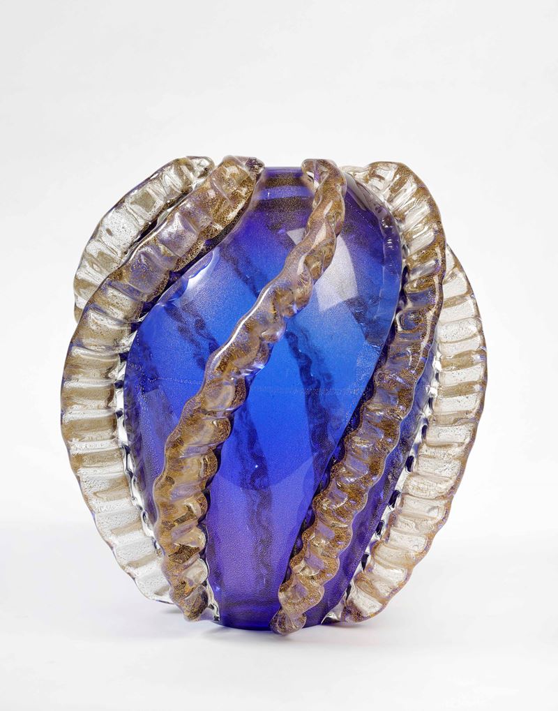 FRANCO MORETTI Vaso in vetro soffiato blu con applicazioni a caldo. Cm 27,5x19. Sotto la base reca firma a punta di diamante Franco Moretti.