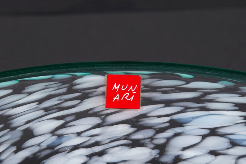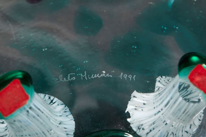 CLETO MUNARI (Gorizia 1930) Centrotavola composto da piatto e ciotola in vetro bianco e verde. 1991. Cm (piatto) 8,5x53,5; (ciotola) 19,5x26; (totale) h 24,5. Opera firmata sotto la base Cleto Munari 1991.