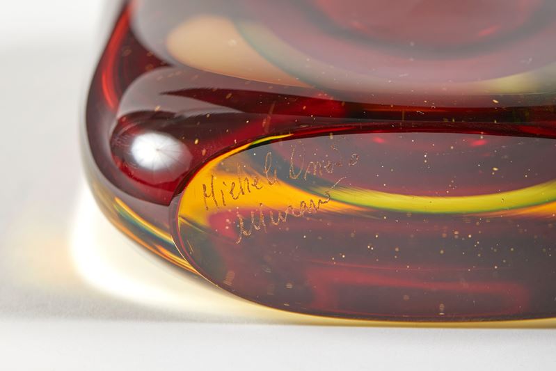 MICHELE ONESTO (XX secolo) Vaso in vetro sommerso sui toni del giallo e del rosso. XX secolo, Italia. Cm 19x14x5. Sotto la base reca firma all'acido Michele Onesto, Murano.