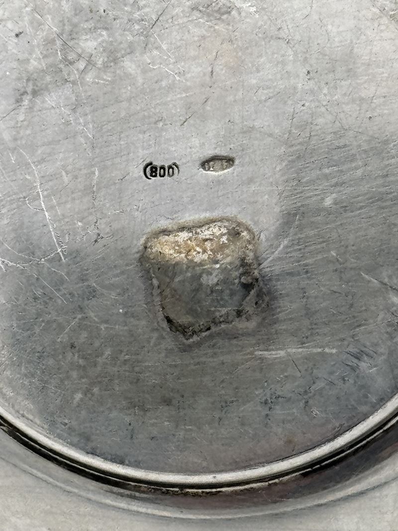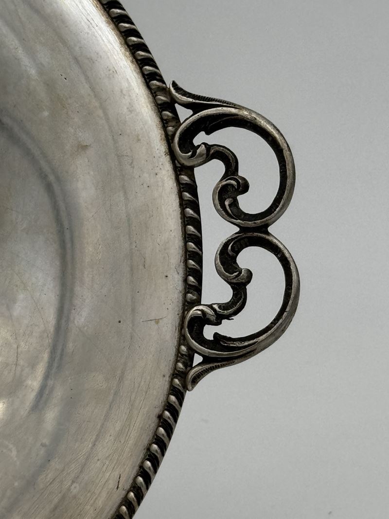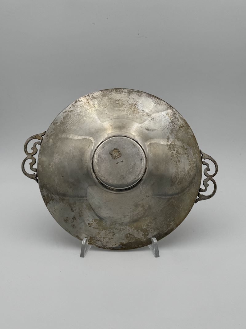 Piattino in argento 800. XX secolo. Reca punzone 800. Cm 21x4. Peso: 298 gr.