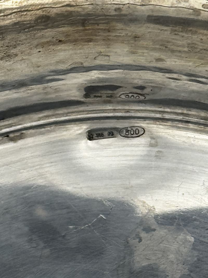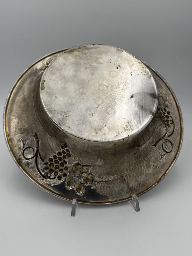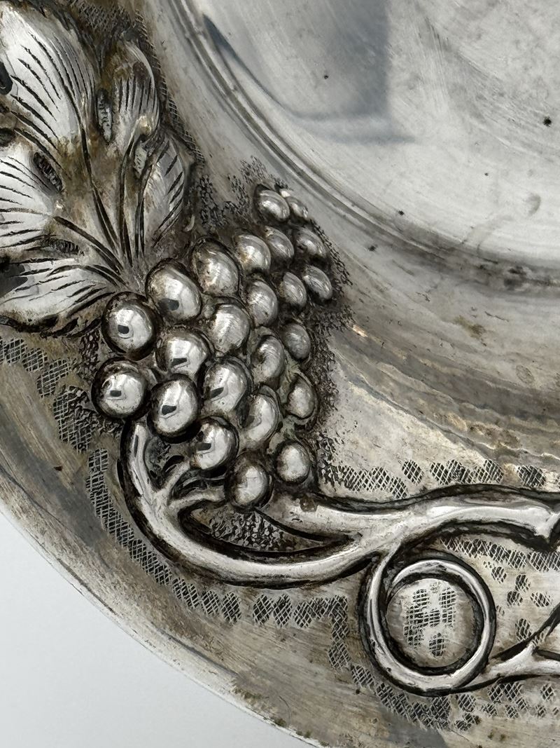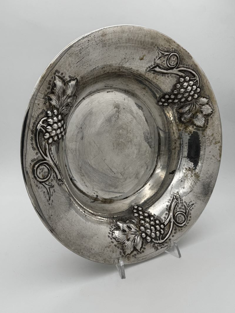Piatto in argento 800 con decori a foggia di uva. XX secolo. Cm diametro 30. Peso: 555 gr. Reca punzone 800.