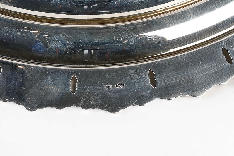 Firenze. Piatto in argento 800. Cm diametro 32. Reca punzoni 313 FI, 800. Peso 549 gr.