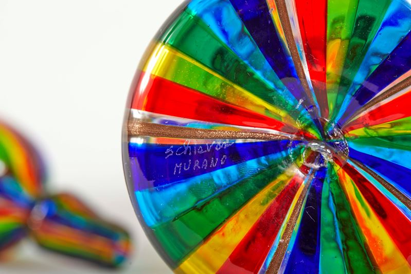 RENO SCHIAVON Bottiglia con tappo in vetro soffiato a bande multicolore. XX secolo, Italia. Cm 31x10. Sotto la base reca firma all'acido Schiavon, Murano.