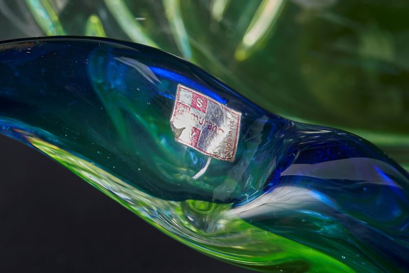 SEGUSO Centrotavola in vetro dalle tonalità verdi e blu con bordo ondulato. XX secolo. Prod. Italia. Cm 11,5x21. Reca etichetta SDV Murano.