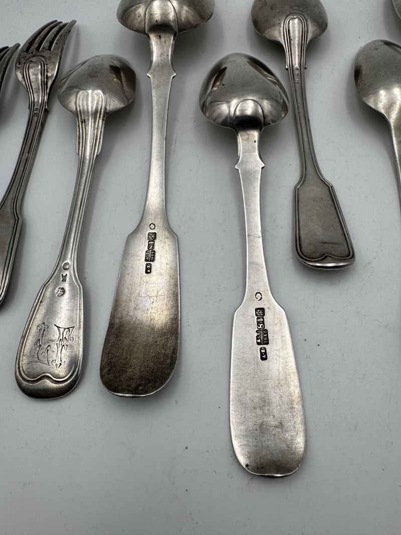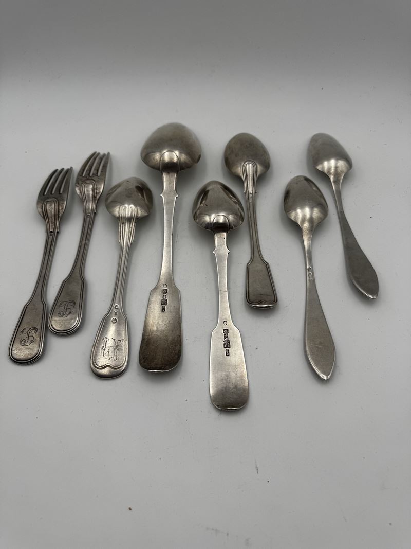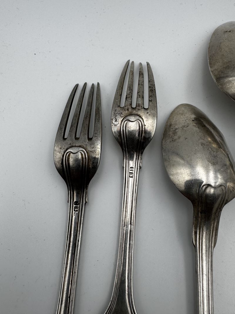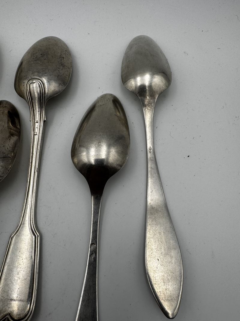 Servizio composto da cucchiai e posate in argento 800. XX secolo, Italia. Recano punzone 800. Peso: 628 gr.