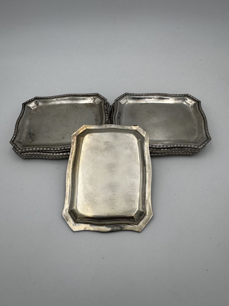 Servizio di 12 piattini portapane in argento 800. XX secolo. Recano punzoni 800. Cm 10x12. Peso: 884 gr.
