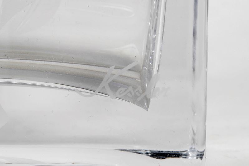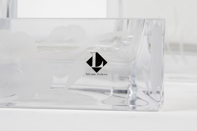 Set in vetro composto da due vasi e una scatolina. Cm h 27; 23; 5,5. Reca marchio Kessler.