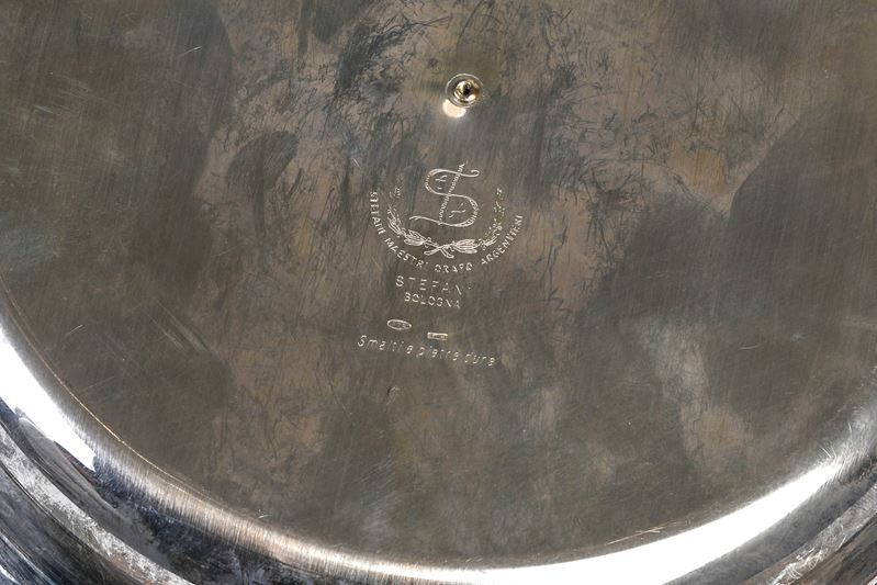 STEFANI MAESTRI ORAFO ARGENTIERI, XX secolo. Fondina dal titolo “Tre piccole grazie”. Argento 800, parti dorate con oro 24 Kt, smalti a gran fuoco, cabochon di pietre dure. Alla base reca firma A. Stefani. Reca sotto la base marchio, tecnica e punzoni. Accompagnato da garanzia di provenienza Stefani, maestri argentieri in Bologna. Peso 317 gr., diametro 22 cm. Reca numeri di tiratura 89/199.