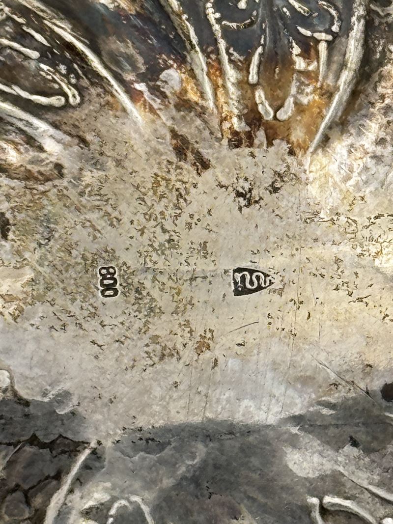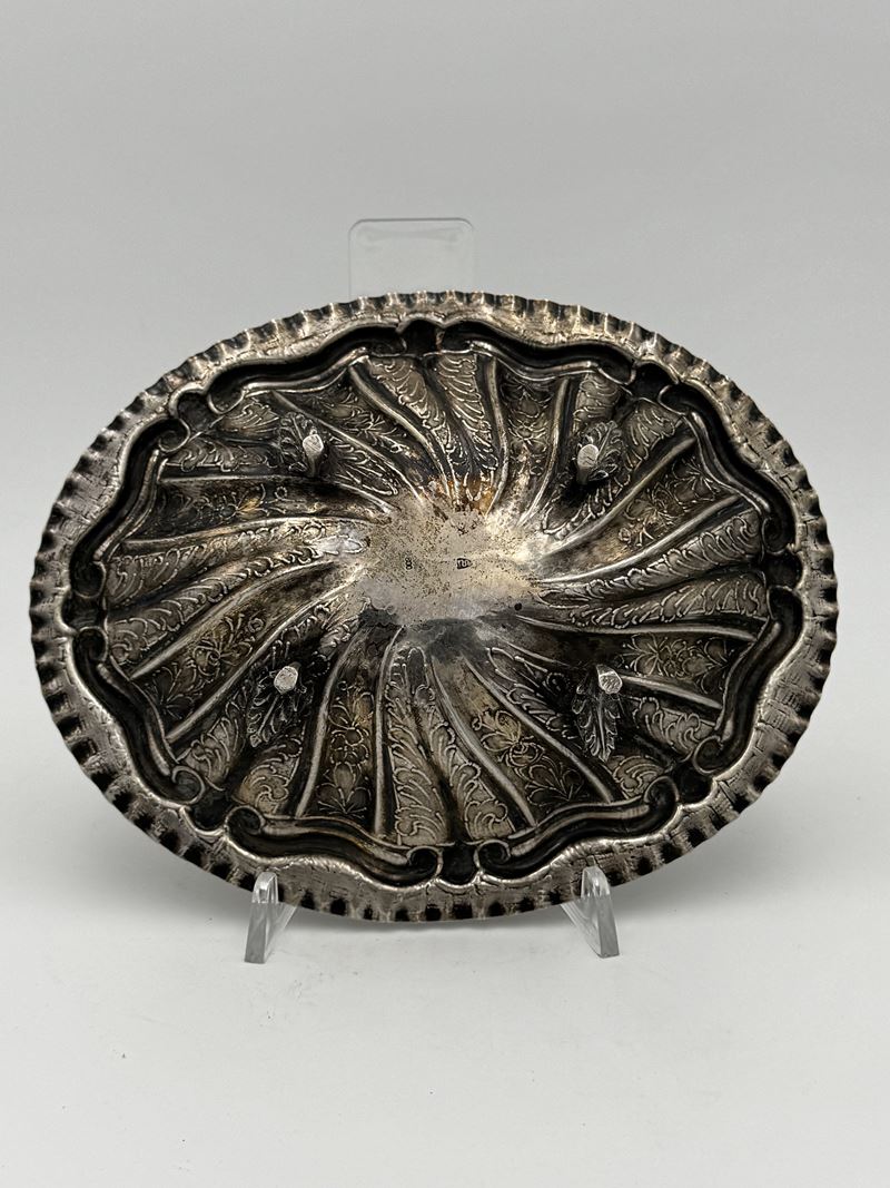 Svuotatasche in argento 800 cesellato. XX secolo. Cm 15x27. Peso: 225 gr.