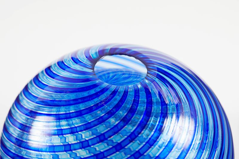 VENINI Ciotola in vetro sui toni del blu composta da due colate concentriche, con un’intercapedine d’aria volutamente lasciata tra lo strato interno e quello esterno. L’effetto finale è quello di una forma “dentro la forma”. XX secolo, Italia. Cm 10x17⌀.