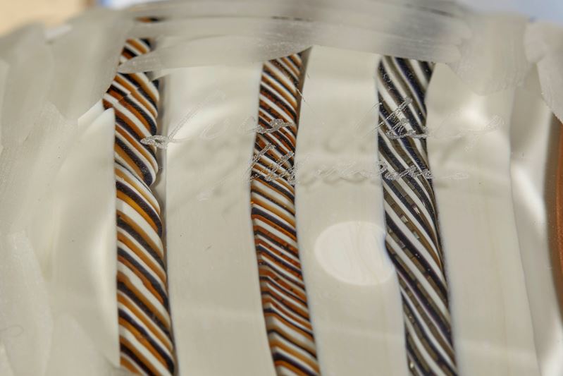 LUCA VIDAL Ciotola in vetro smaltata sui toni del bianco con disegni geometrici. XXI secolo, Italia. Cm 7,5x22,5x17,5. Sotto la base reca firma all'acido Luca Vidal, Murano.