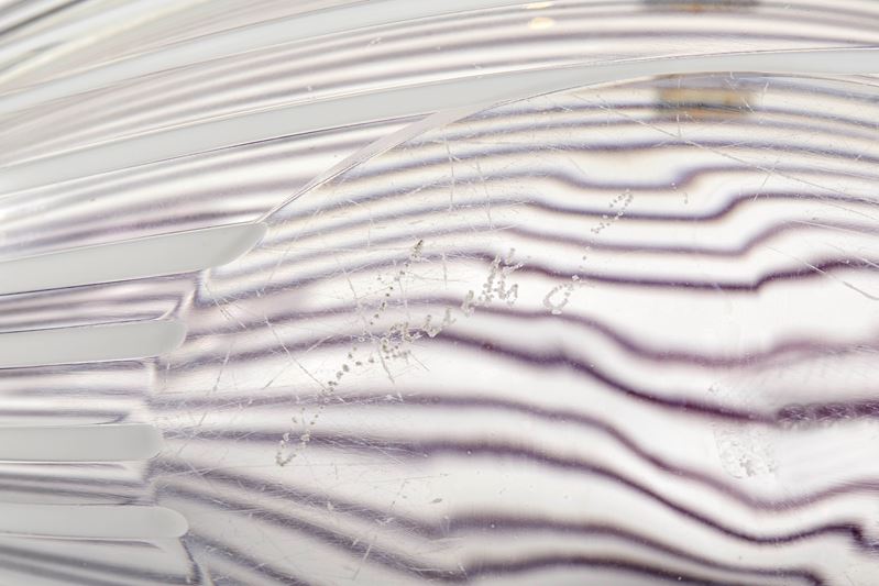 LICIO ZANETTI (1915 - 1985) Cigno in vetro smalto a righe bianche e vinaccia. XX secolo, Italia. Cm 21x30x11. Sotto la base reca firma all'acido Zanetti L.