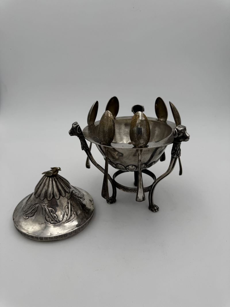 Zuccheriera con sei cucchiaini in argento. XX secolo. Recano punzoni. Cm 10x9. Peso: 442 gr.