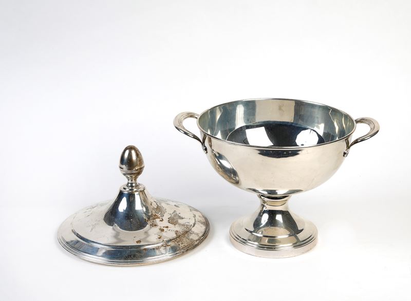 RINO GREGGIO Zuppiera in argento 800. Cm 30x26x22. Reca punzoni: 800, 29 PD. Peso: 963 gr.