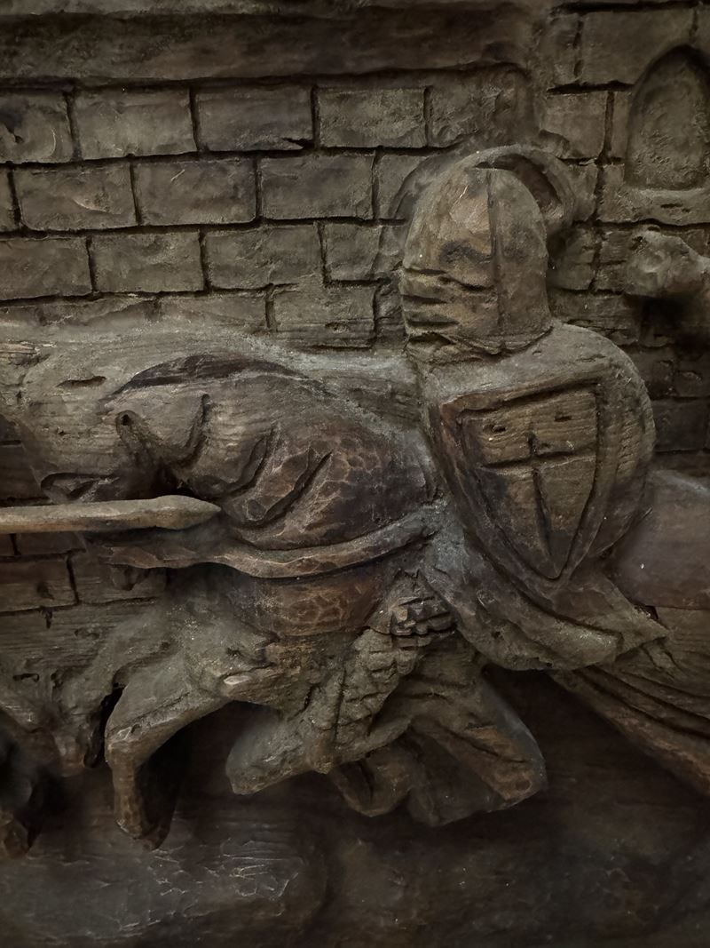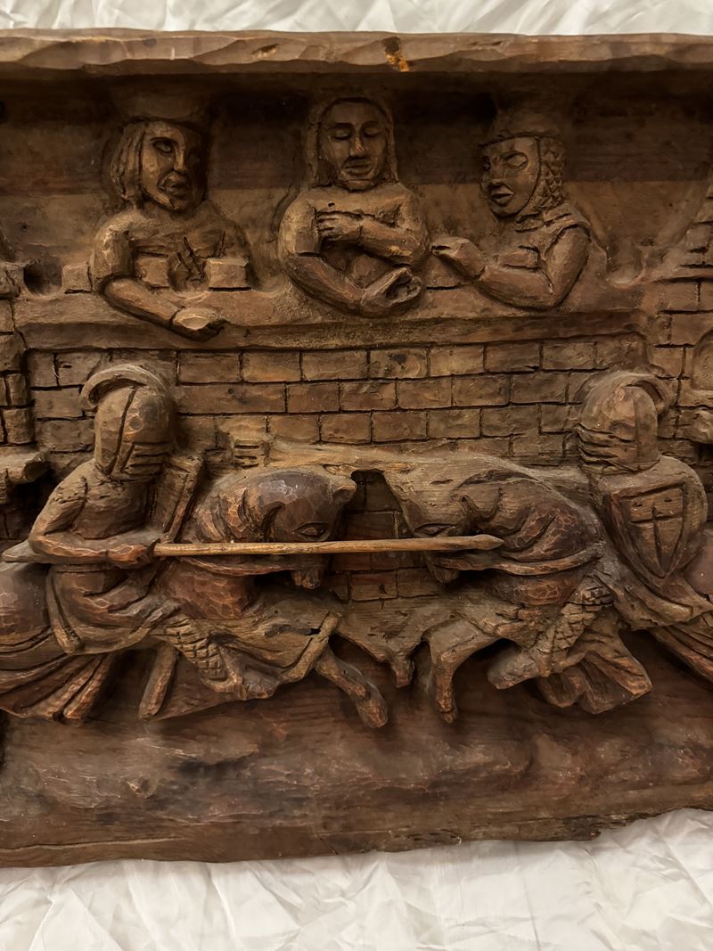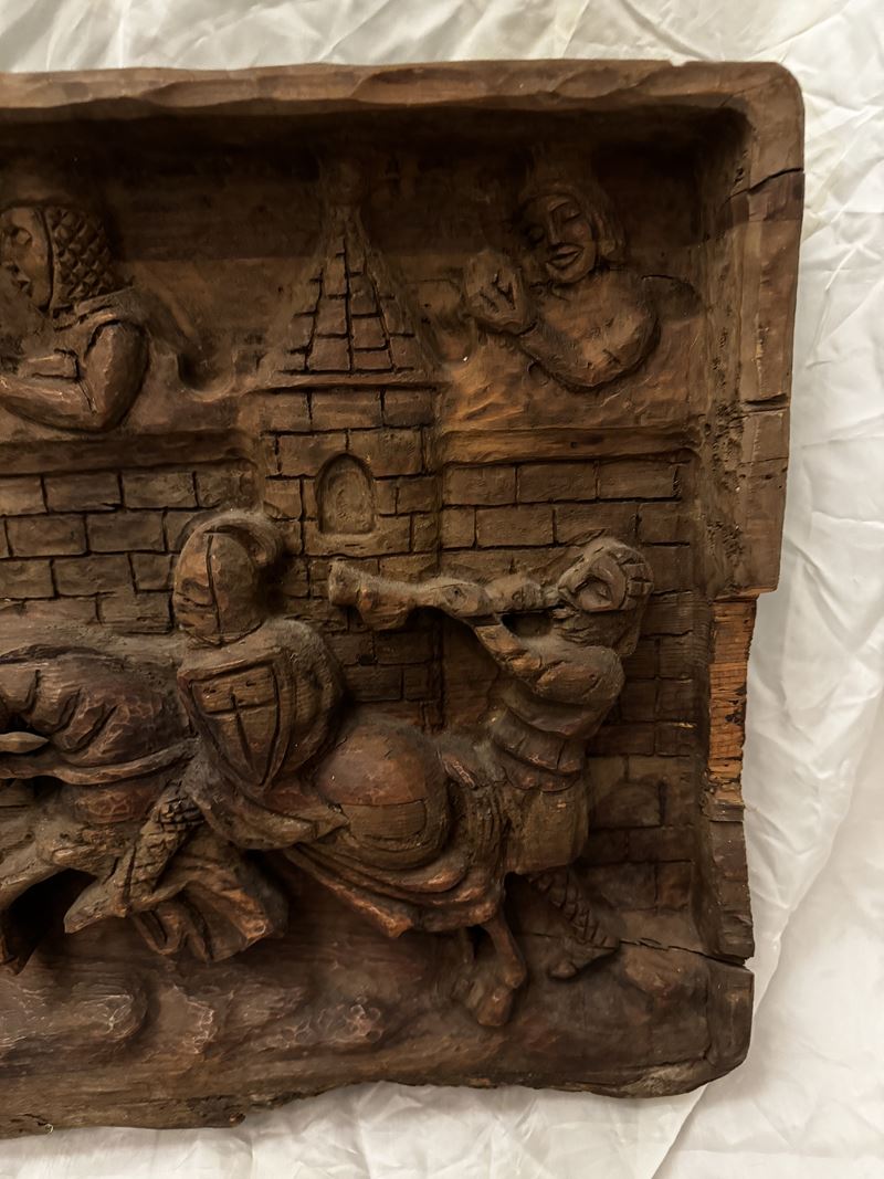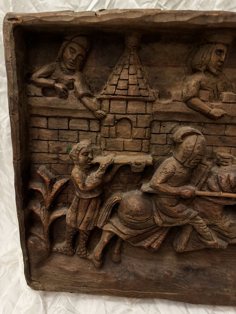 Altorilievo in legno con scena di battaglia, probabilmente una sponda di carretto. XIX secolo. Cm 45x75x7.