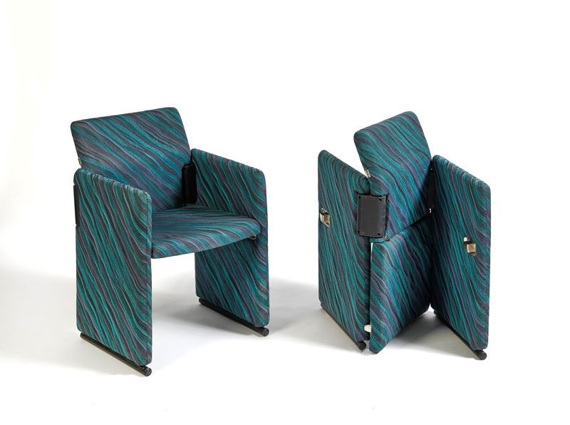 FRANCO BUZZATI ED ENRICO ROCCHI Coppia di poltrone modello Roota in tessuto colorato. 1980 circa. Prod. Deko, Italia. Rispettivamente di cm: 80x55x50.