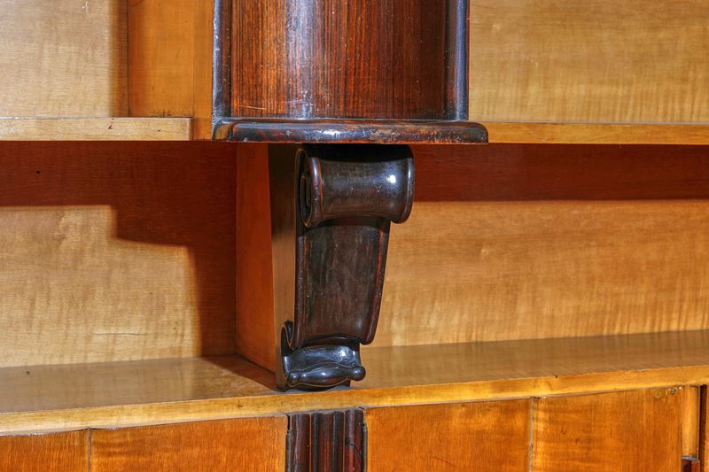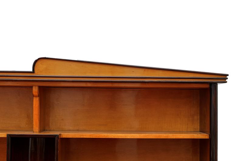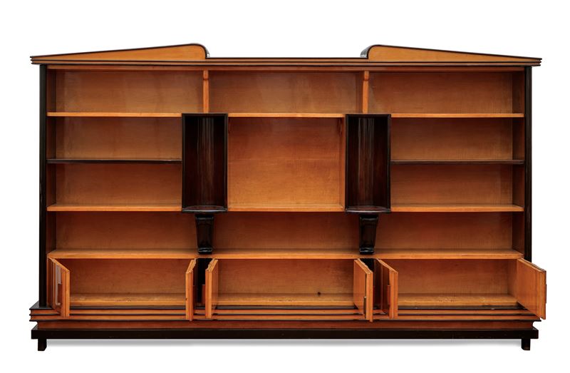 TOMASO BUZZI (Sondrio, 1900 - Rapallo, 1981) Importante mobile libreria da parete, in legno chiaro e dettagli ebanizzati. Reca ripiani su tre livelli, due elementi a colonna concava centrale, quattro ante inferiori. 1930 - 1940 circa. Prod. Italia. Cm 173x290x34.