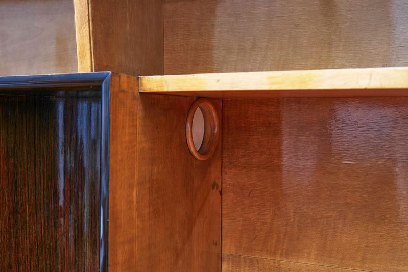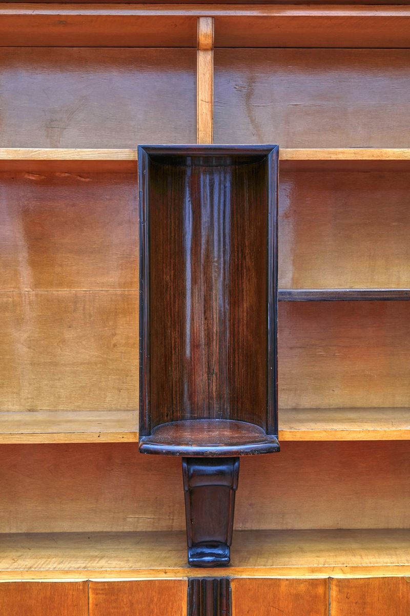 La struttura presenta ripiani a giorno su tre livelli, interrotti da due nicchie concave che fungono da elementi architettonici decorativi e funzionali. La base è scandita da una sequenza di quattro sportelli inferiori a battente. Il profilo superiore, lievemente inclinato alle estremità, e la ricercatezza dei dettagli decorativi richiamano le cifre stilistiche del razionalismo italiano e in particolare del gusto di Tommaso Buzzi, tra i principali interpreti del gusto déco italiano.