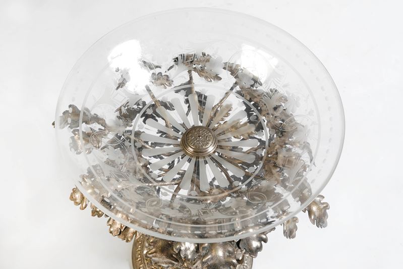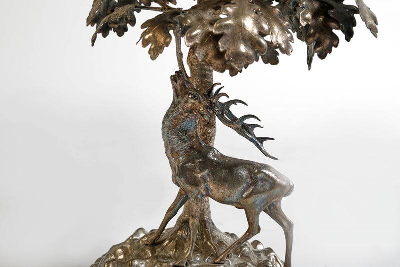 Centro tavola in alpaca a foggia di foglie di quercia e cervo, con ciotola in cristallo inciso. Anni ’40. Cm 48,5x38 Ø.