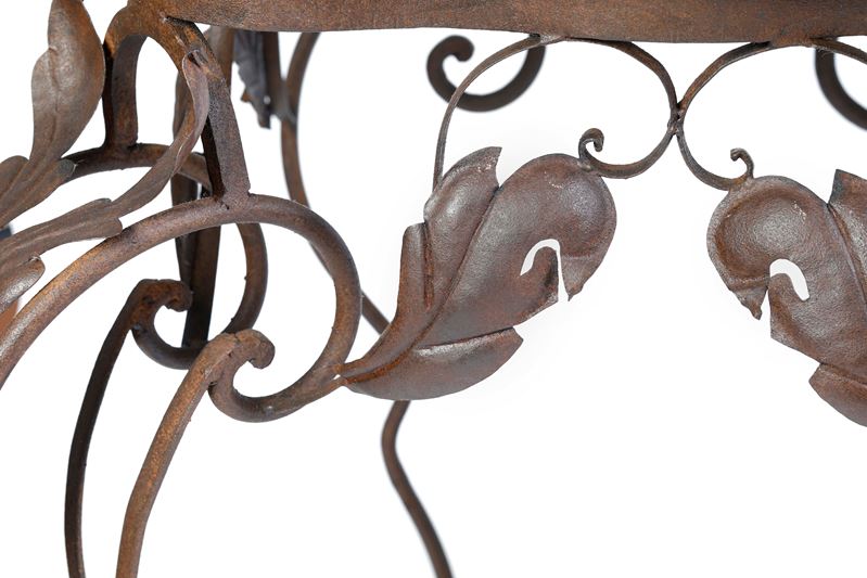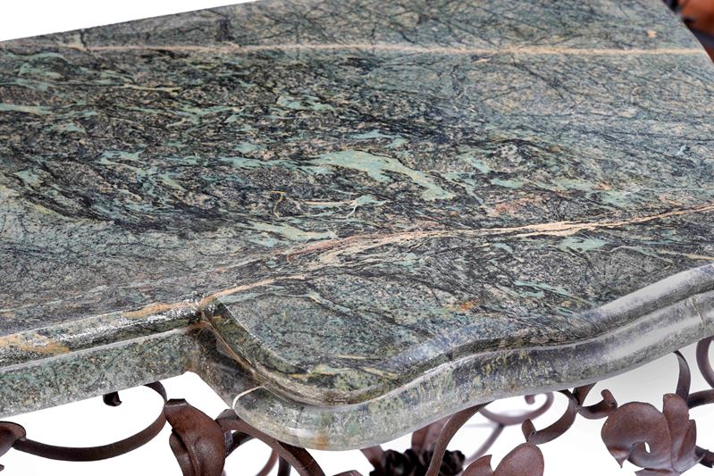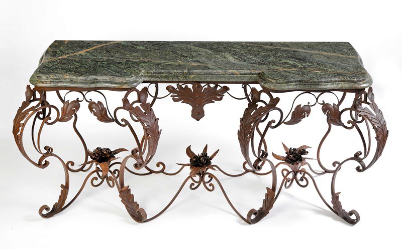 Consolle Art Nouveau in ferro battuto a tema floreale con piano in marmo verde. XX secolo. Cm 83x163x57.