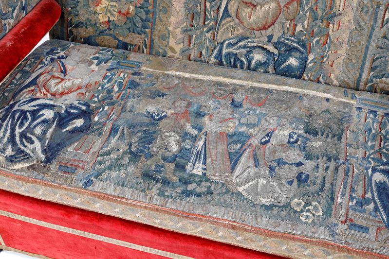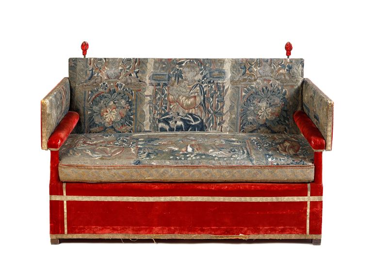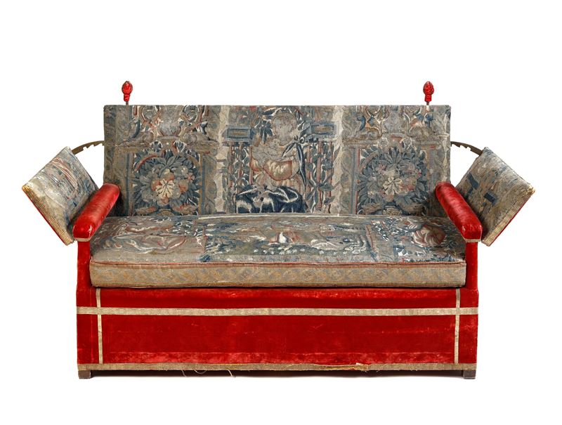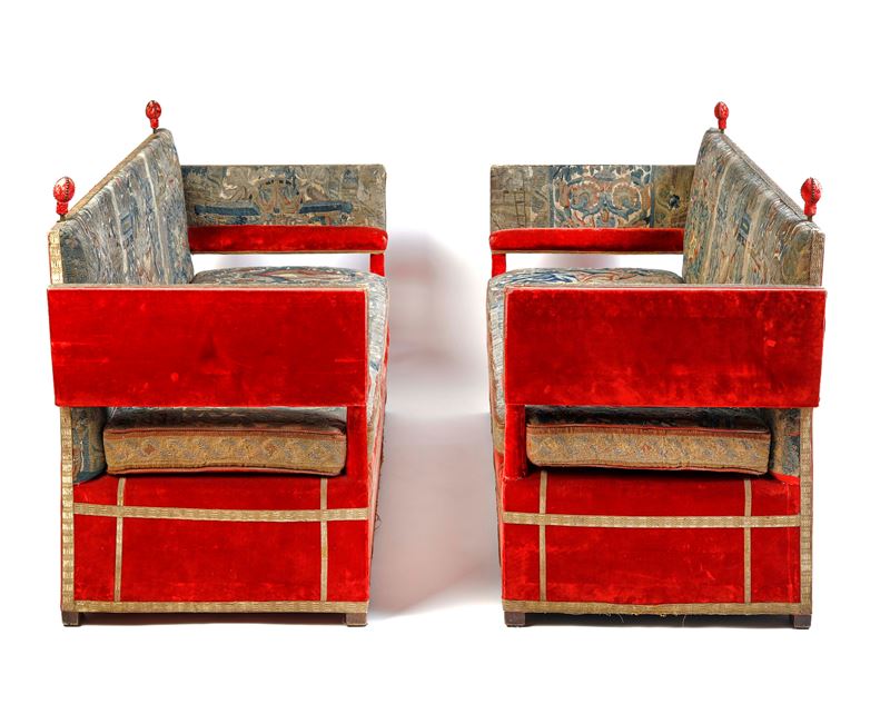 Coppia di divani inglesi in velluto rosso, con seduta ricamata ad arazzo. XVIII secolo. Cadauno cm 99x148x70.